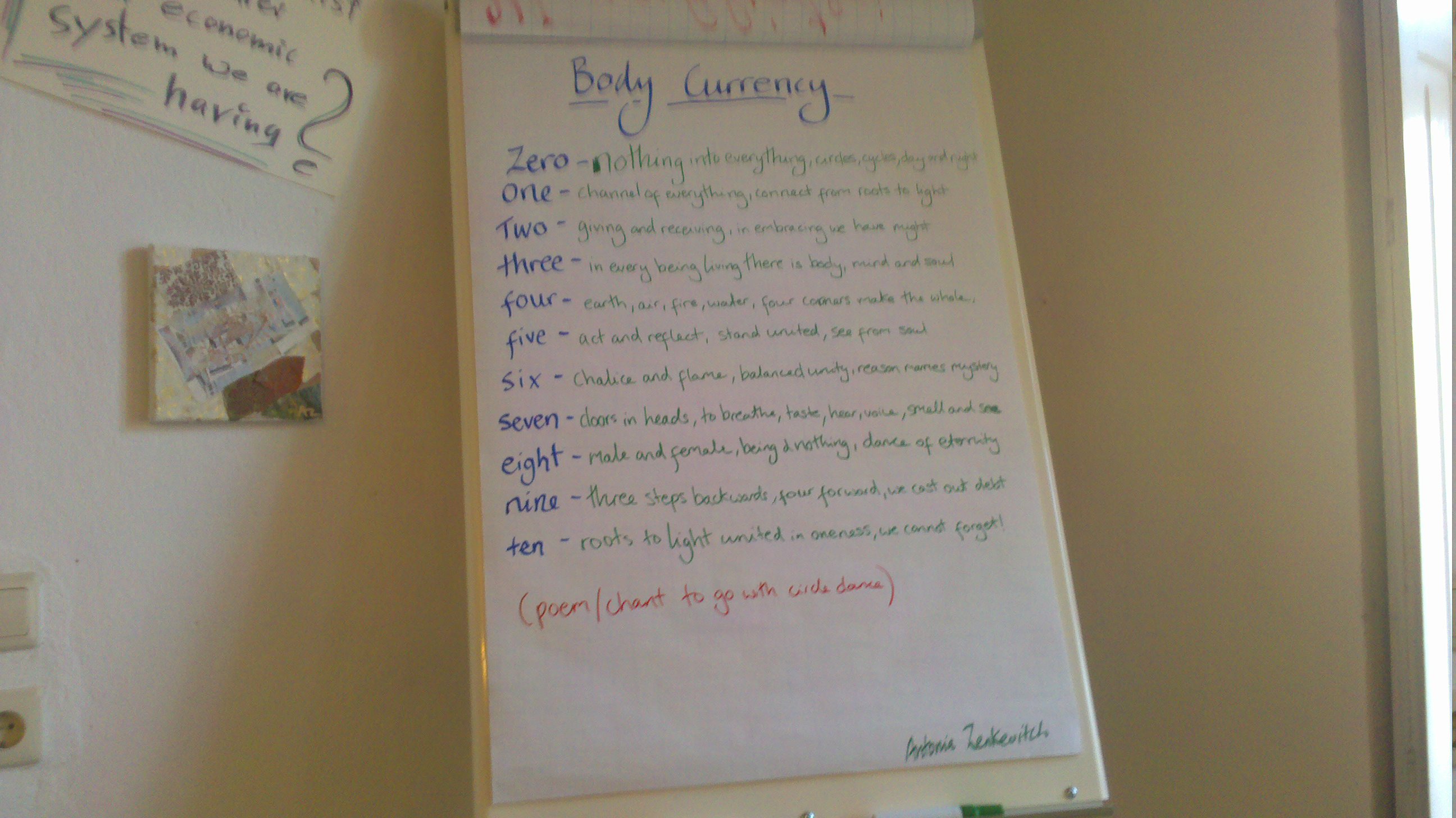 Inspired by the recreation of money or the idea of it I filled bags full of assorted seeds, herbs, crystals. I made designs of money out of destroyed cheques, painted a tree around a coin no longer in currency and created a dance entitled ‘body currency’. Our understanding was once in part physical and with that comes a sense of value and ownership. Zero is a circle, which in turn is as much everything as nothing. The number 8 is a symbol of eternity too. Two is partnership whilst 1 is self reliance. It was also a great excuse for us all to dance, inspired by the poem, creating movements from the template of the words in a combination of belly-dance, circle dance and laughter.