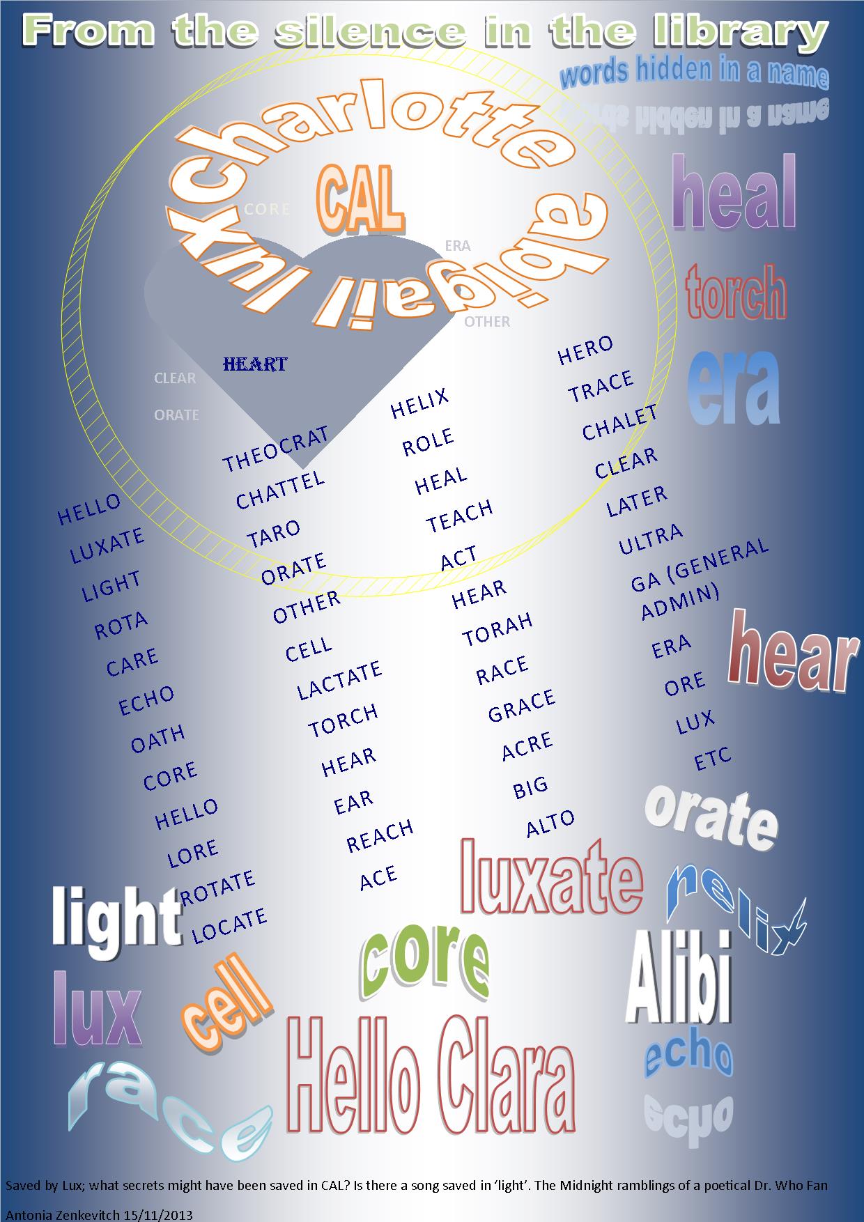 The words hidden in one character’s name could help fuel the Whovian theories of a connection between Charlotte Abigail Lux (CAL) and Clara Oswin Oswald. (CAL) and ‘The Silence in the Library’ episode became to me a wordsmith’s dream, flesh munching shadow monsters not-withstanding. As you can see in the word collage I created below, using letters within her name we can create: Helix ( a curve in 3 dimensional space reminiscent of a vortex);Hello Clara; luxate (to dislocate); locate; oracle; light; alibi; clothe; rotate; locate; theocrat; big; GA – general administrative; lore; oath; late; rota (wheel / rotation), Tora / Torah (a book of life and law);Taro (the fool’s path / the alphabet in images); chattel; act, heal; hear, heart; core; cell; ear; teach; reach; throat and more. GI (acronym for Great Intelligence is in there) Granted, words such as toe and hallux (big toe) are also hidden in there somewhere and I’m not sure where I could go with that …. but messages hidden in words are very Doctor. The power of any story is in the listener becoming part of the weaving, opening up to imagination and the power of word and image. There is a great deal of potential with Charlotte Abigail Lux. Brief though her role seems to be she appears part of a ‘clan’ of personalities moving within virtual space in the timepath of The Doctor, shifting between corporeal to non-corporeal form, life and death, memory and manifestation.